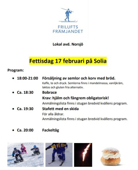 Försäljning av semlor, varmkorv och dryck. Bobrace och stafett med slalomskidor, priser till alla som deltar.